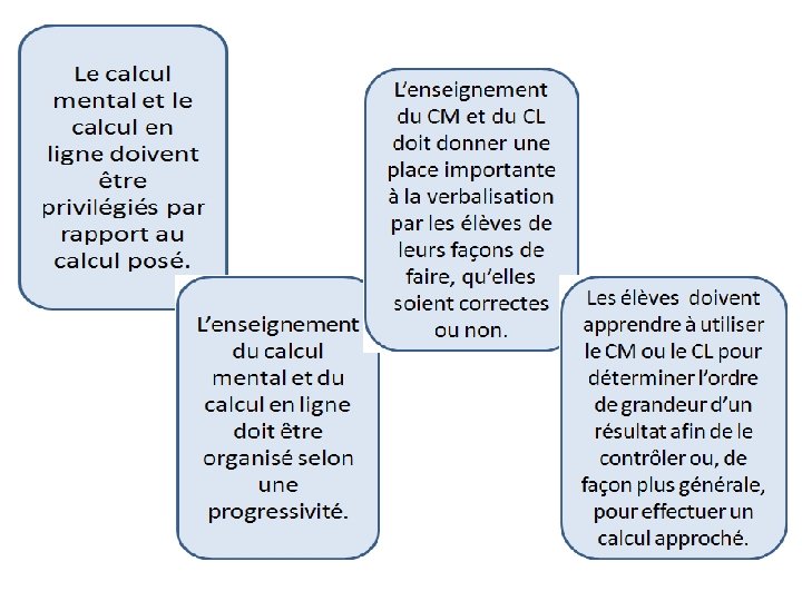 Calcul ou Calculs? CALCUL MENTAL Pas de traitement écrit du calcul lui-même, même si le résultat peut être écrit CALCUL POSE Usage d’une technique opératoire CALCULS CALCUL INSTRUMENTE Utilisation d’un abaque, d’un boulier, d’une calculatrice ou d’un tableur CALCUL EN LIGNE Modalité de calcul écrit ou partiellement écrit