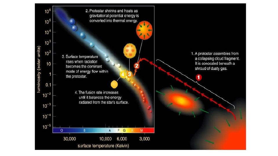 Protostars and Nuclear Fusion • When H nuclei get close enough they form He nuclei – nuclear fusion • This process releases energy. • Protostar when fusion begins • Nuclear fusion happens in all stars including our Sun