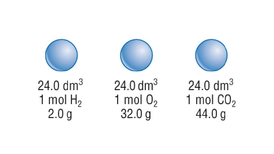 Example How many moles are there in 6. 0 dm 3 of oxygen at r. t. p. ? Number of moles = 6. 0 / 24 = 0. 25 moles of oxygen molecules
