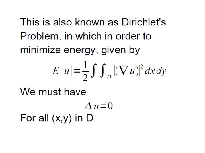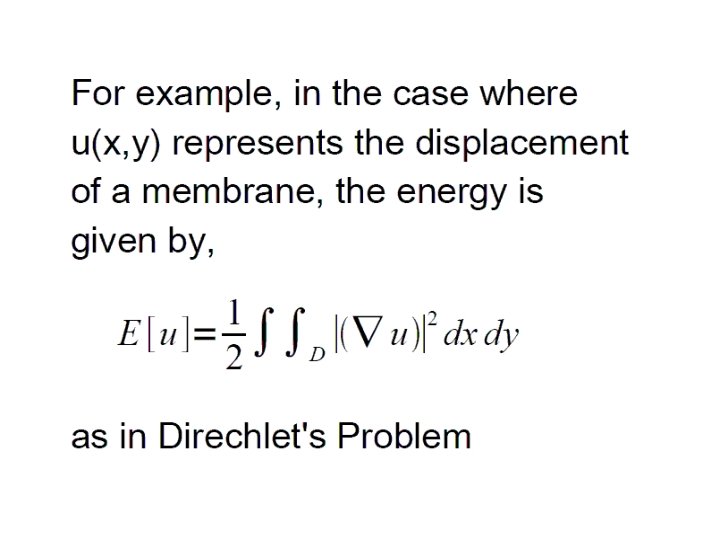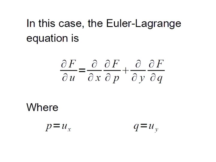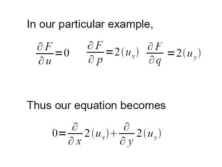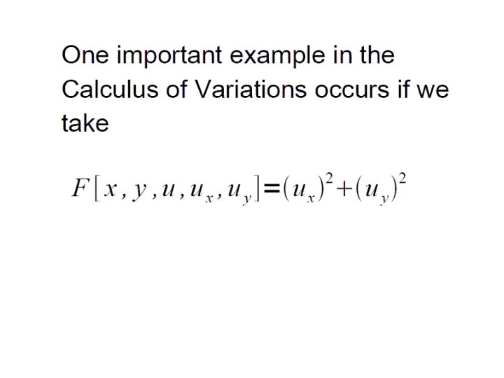 Functions of Two Variables • Analogy to multivariable calculus: • Functions still take extreme values on bounded domain. • Necessary condition for extremum at x 0, if f is differentiable: • Calculus of variations method similar: