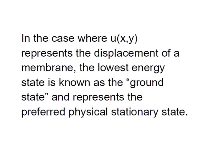 Principle of Least Action Energy of a Vibrating String Action = Kinetic Energy – Potential Energy • Calculus of variations can locate saddle points • The action is stationary at ε = 0 Explicit differentiation of A(u+εv) with respect to ε Integration by parts v is arbitrary inside the boundary D This is the wave equation!
