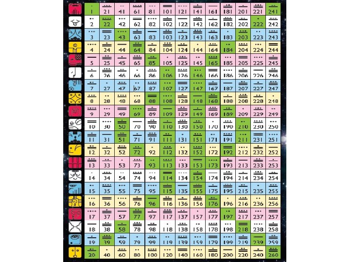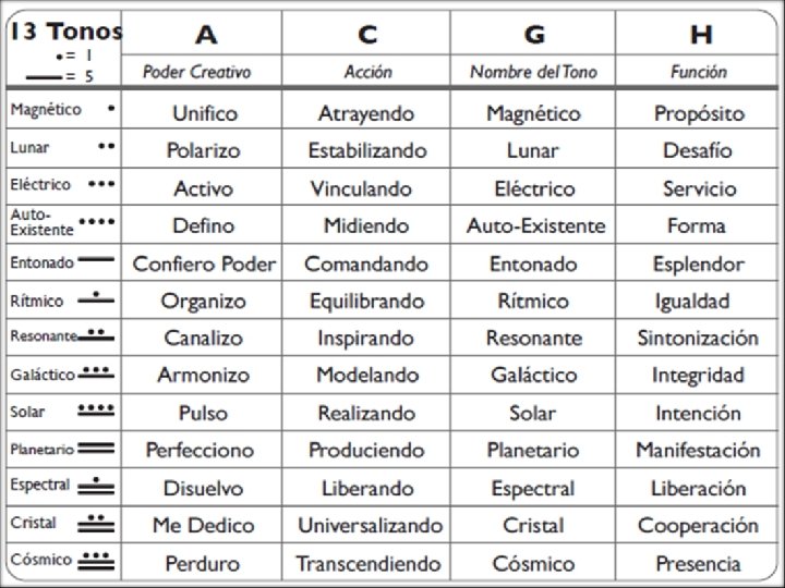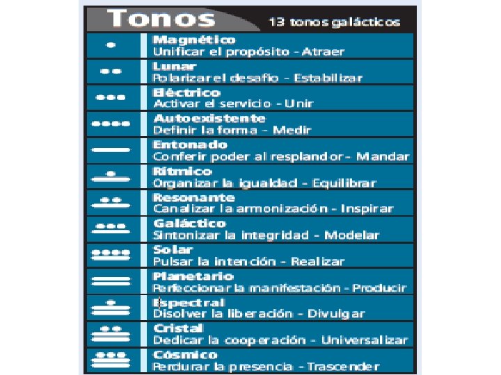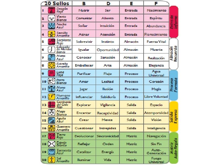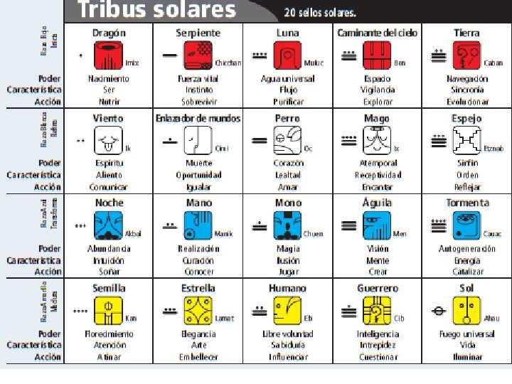 MATRIZ 13: 20 – TZOLKIN Módulo Armónico • Formado por la combinación de los 20 sellos y los 13 tonos: • 20 x 13 = 260 Kin – Días • Cada uno hemos nacido en un día concreto que tiene una Firma Galáctica con Sello-Tono. Color. • Los colores siempre van en este orden: Rojo – Blanco – Azul - Amarillo