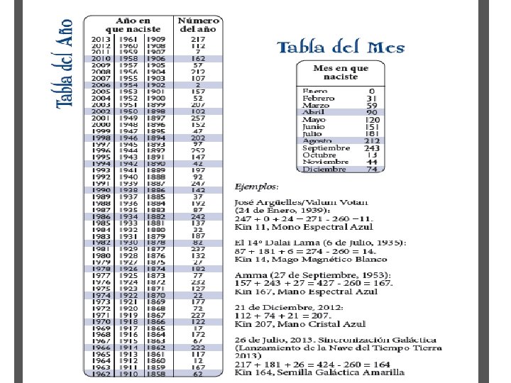 TABLA PÁGINAS 16 -17 4 de agosto del 2012 • Año de nacimiento en la “Tabla del Año”: 2012……nº de año ……. . = 112 • “Tabla del Mes”: agosto= 212 • “Suma el día del mes”…. = 4 • Suma total = 328 • Le restamos 328 – 260 = 68 = Kin 68 Estrella Eléctrica Amarilla