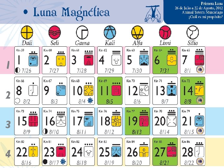 Calendario-Sincronario de las 13 Lunas Cada día pertenece a una Luna, es el ORDEN CÍCLICO. 13 Lunas de 28 días= 364+DFT Tiene una Firma Galáctica del Tzolkin, y se convierte en el ORDEN SINCRÓNICO. Un Tzolkin de 260 días, más 105 días del siguiente Tzolkin: 260 + 104 + DFT = 365 Días La Firma Galáctica de alguien que nace el día 4 de agosto del 2012