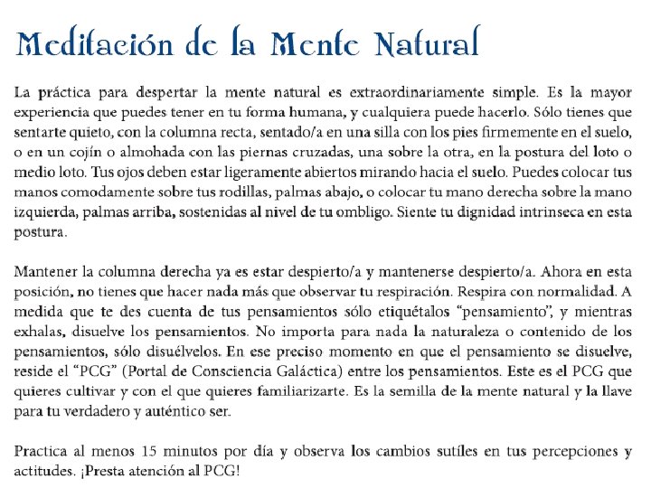 PREPARACIÓN PARA EL FINAL DEL CICLO • • Vivir con el Sincronario de las 13 Lunas Seguir el Orden Sincrónico diario Meditación de Mente Natural Meditación de Desatando los Nudos Meditación del Puente Arco Iris Circumpolar Ser más conscientes en el día a día Desapegarnos del ego