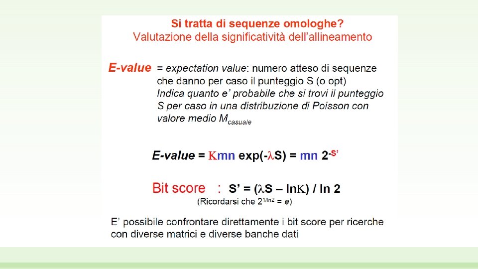 MA COME SI FA A DEFINIRE QUANTO «BUONO» E’ UN ALLINEAMENTO? Posso definire due sequenze come omologhe (e quindi aventi uno score di similarità significativo) solo nel momento in cui il suo score cade fuori dalla distribuzione dei punteggi ottenuti con le sequenze casuali HIT non casuale Gli hit casuali si distribuiscono in una distrubuzione di Poisson (come quella che vedete a fianco), che viene utilizzata in complesse formule matematiche per determinare un valore probabilistico P di un allineamento casuale Distribuzione dei punteggi casuali