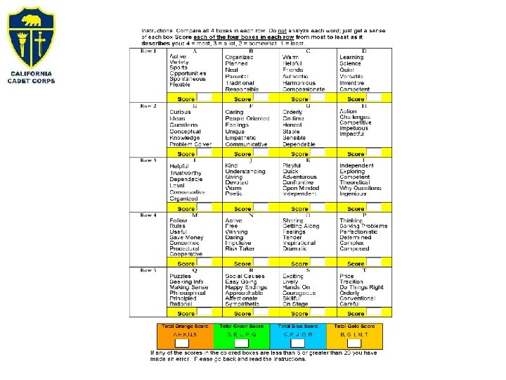 True Colors • Shows us how to approach, communicate, educate and even discipline someone more effectively within their natural framework. • For example: – A student who is gold will respond better to guidelines than an orange. – A blue will respond better to an emotional plea while a green will expect rational and reasoning.