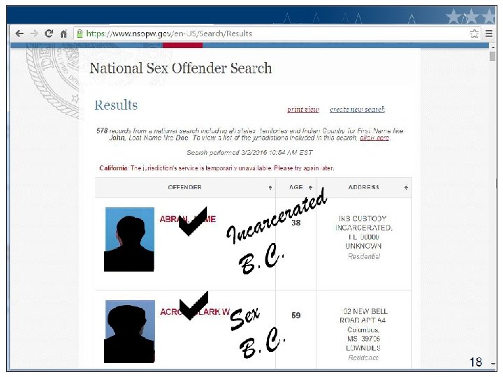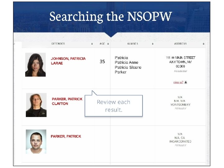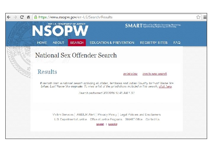 NSOPW. gov 1. Nationwide NSOPW. gov (all areas reporting – if a state isn’t reporting, either go directly to their state sex offender registry (google it) and print results, or recheck NSOPW. org later) 2. Documentation – print screen of the results 3. Any ‘hits’ must be printed and resolved (if needed, click thru to info. ) 4. Include notes to show all were cross-checked, and determined not to be the applicant 5. Sign the printout and then note the date this was performed on CV’s NSCHC Verification Form 22