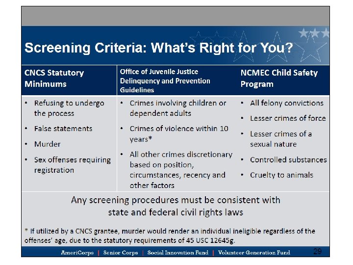CV has two tools to help you DO and DOCUMENT the checks • CV NSCHC Checklist – outlines each step needed to perform compliant checks • CV’s California Ameri. Corps State NSCHC Verification Form – documents everything in one place 28