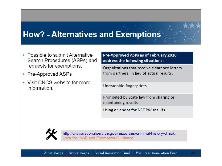 Confidentiality California law prohibits the actual results from being shown to others (including CNCS or CV). Actual results, aka. ‘RAP sheets’, must be locked up with Custodian of Record-only access CNCS has a Pre-Approved Alternative Search Procedure (ASP) for this, which states each file must document this limitation in writing, and that all aspects of checks and clearance were compliant. You must also document the source, dates, clearance decision, and signature of reviewer and date they cleared the person. CV’s Verification form includes ALL of this. 27