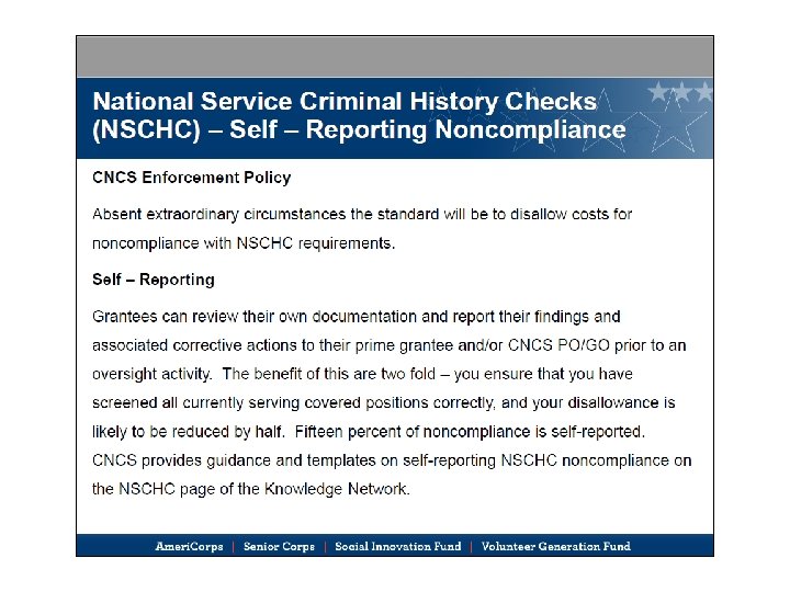Non-Compliant Checks • CNCS 2017 NSCHC Enforcement Guide • Based on risk-mitigation levels • The more you’ve done right, the less this hurts! 45