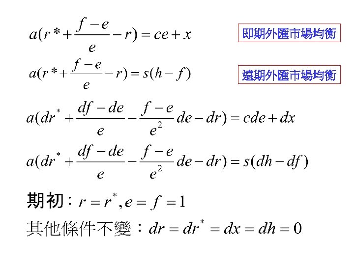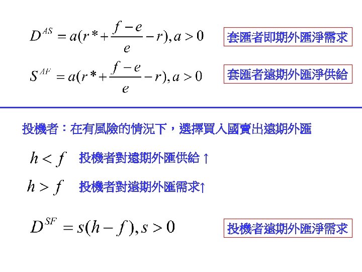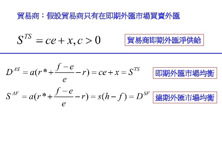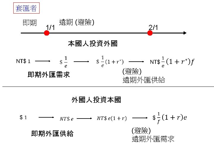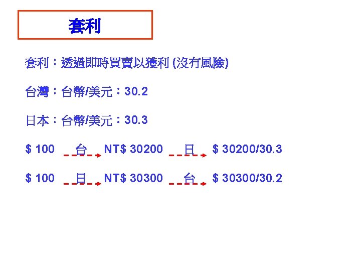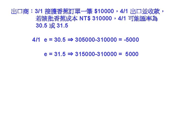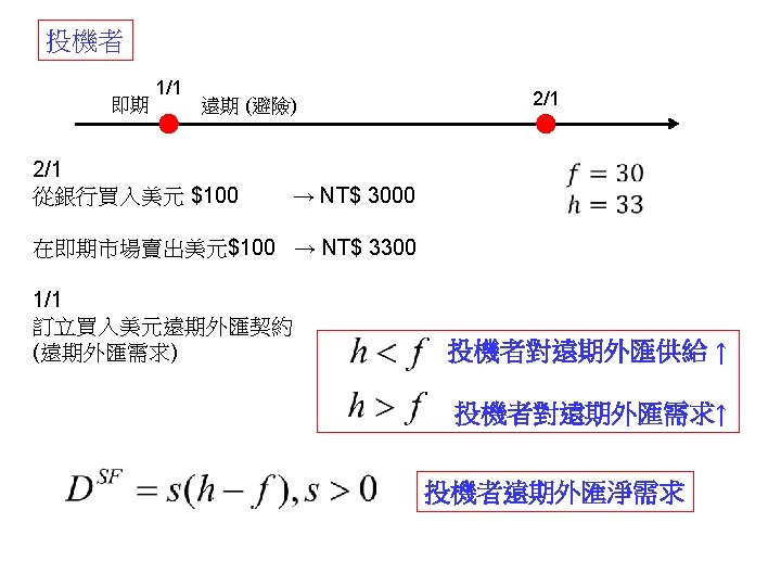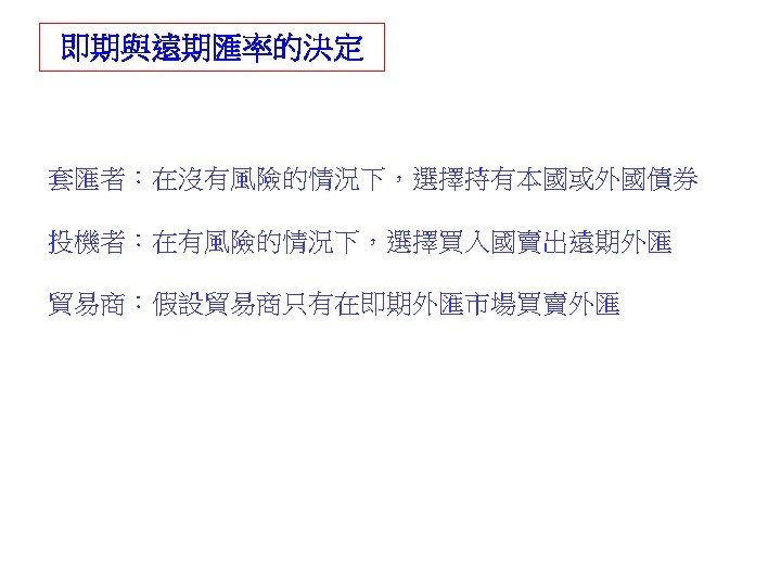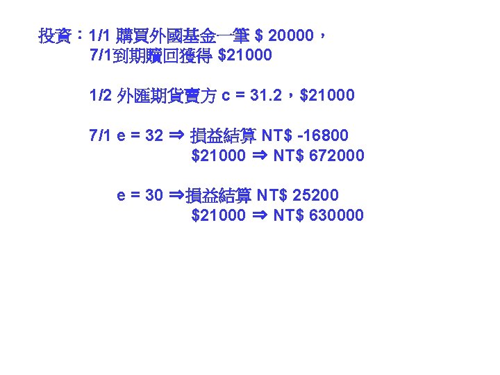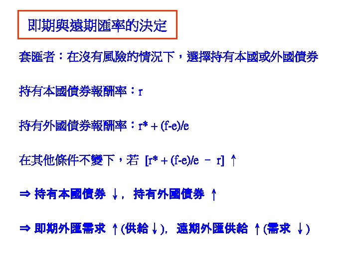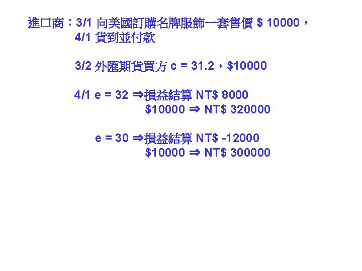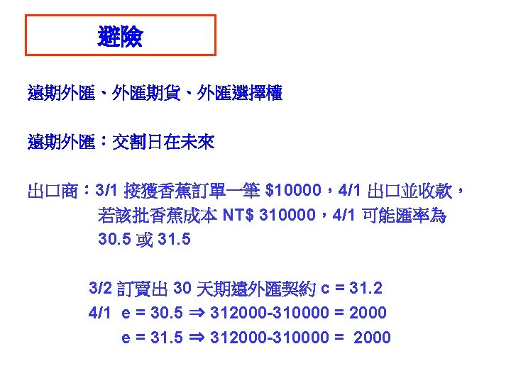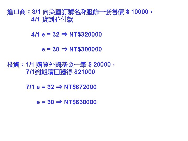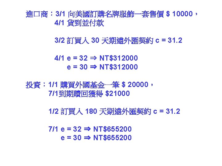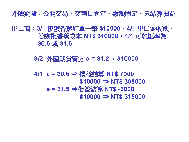 call option put option 31 1000041 NT 31000041 Slides: 30 Download presentation 外匯選擇權 買入選擇權 (call option) 賣出選擇權 (put option) 出口商: 3/1 接獲香蕉訂單一筆 $10000,4/1 出口並收款, 若該批香蕉成本 NT$ 310000,4/1 可能匯率為 30. 5 或 31. 5 3/2 買入 put option, c = 31. 2 ,$10000 4/1 e = 30. 5 ⇒ put option ⇒ NT$ 312000 $10000 ⇒ NT$ 305000 e = 31. 5 ⇒ put option ⇒ NTS 312000 $10000 ⇒ NT$ 315000 進口商: 3/1 向美國訂購名牌服飾一套售價 $ 10000, 4/1 貨到並付款 3/2 買入 call option, c = 31. 2 ,$10000 4/1 e = 30. 5 ⇒ call option ⇒ NT$ 312000 $10000 ⇒ NT$ 305000 e = 31. 5 ⇒ call option ⇒ NTS 312000 $10000 ⇒ NT$ 315000 投資: 1/1 購買外國基金一筆 $ 20000, 7/1到期贖回獲得 $21000 3/2 買入 put option, c = 31. 2 ,$21000 4/1 e = 30. 5 ⇒ put option ⇒ NT$ 655200 $21000 ⇒ NT$ 640500 e = 31. 5 ⇒ put option ⇒ NT$ 655200 $21000 ⇒ NT$ 661500 $ 100 NT$/$ 日 NT$ 30300 S 台 $ 30300/30. 2 NT$/$ S 30. 3 30. 2 D 美元 NT$ 100 台 $10/3 NT$ 100 日 Yen 340 Yen 1000/3 美 美 Yen/NT$ $3. 4 台 日 NT$ 98. 039 NT$ 102 $/Yen 日 美 S 3. 4 S 0. 01 D D NT$ Yen NT$ 100 日 Yen 340 美 NT$/$ 台 S 30 D $ $3. 4 台 NT$ 102 Uncovered interest rate parity (未拋補利率平價理論) Covered interest rate parity (拋補利率平價理論) f : 遠期匯率 f SS FF e