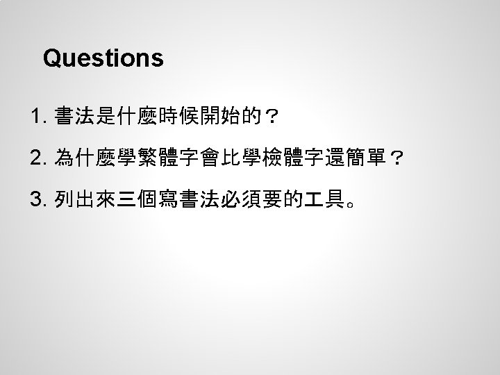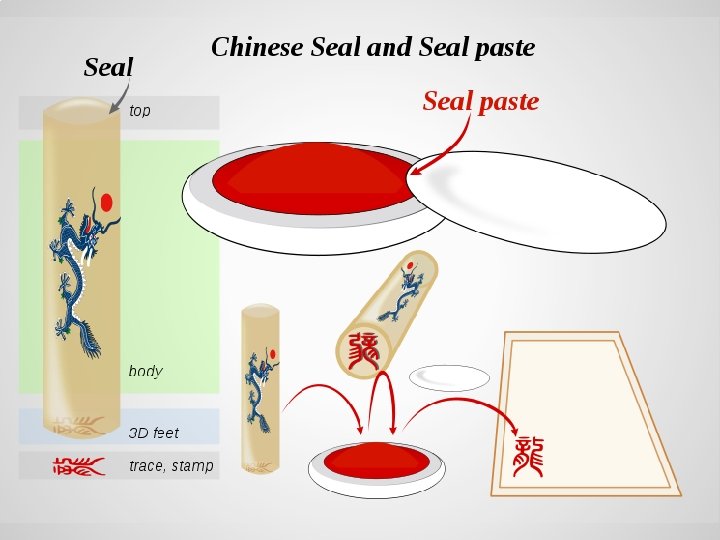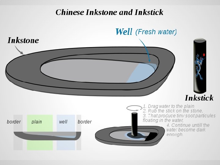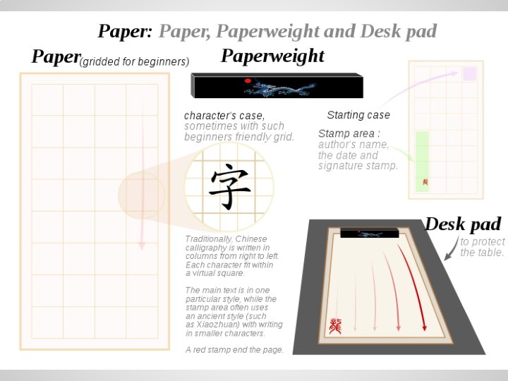 Origin (continued) (3/4) 寫書法會讓心情保持平靜。歷史說有很多中國和 日本的書法家都長壽。 Chinese calligraphy helps keep one's mood peaceful and calming -- very relaxing. Historians say that it is known that many calligraphers from China and Japan live long lives. 寫書法必須要的 具有:毛筆, � , �� , 台� , 墨水和墨棒, �台 , 印章, 等等。 The required tools to do Chinese Calligraphy are: brushes, paperweights, desk pads, ink sticks, and inkstone etc.