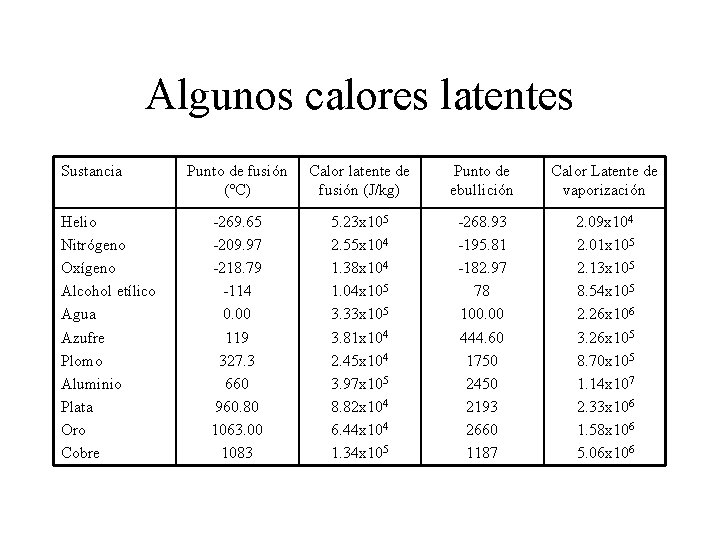 Algunos calores latentes Sustancia Helio Nitrógeno Oxígeno Alcohol etílico Agua Azufre Plomo Aluminio Plata Oro Cobre Punto de fusión (°C) Calor latente de fusión (J/kg) Punto de ebullición Calor Latente de vaporización -269. 65 -209. 97 -218. 79 -114 0. 00 119 327. 3 660 960. 80 1063. 00 1083 5. 23 x 105 2. 55 x 104 1. 38 x 104 1. 04 x 105 3. 33 x 105 3. 81 x 104 2. 45 x 104 3. 97 x 105 8. 82 x 104 6. 44 x 104 1. 34 x 105 -268. 93 -195. 81 -182. 97 78 100. 00 444. 60 1750 2450 2193 2660 1187 2. 09 x 104 2. 01 x 105 2. 13 x 105 8. 54 x 105 2. 26 x 106 3. 26 x 105 8. 70 x 105 1. 14 x 107 2. 33 x 106 1. 58 x 106 5. 06 x 106