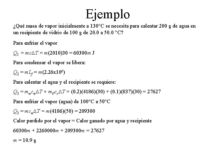 Ejemplo ¿Qué masa de vapor inicialmente a 130°C se necesita para calentar 200 g de agua en un recipiente de vidrio de 100 g de 20. 0 a 50. 0 °C? Para enfriar el vapor Q 1 = mc. DT = m(2010)30 = 60300 m J Para condensar el vapor se libera: Q 2 = m. Lf = m(2. 26 x 106) Para calentar el agua y el recipiente se requiere: Q 3 = mwcw. DT + m. Vcv. DT = (0. 2)(4186)(30) + (0. 1)(837)(30) = 27627 Para enfriar el vapor (agua) de 100°C a 50°C Q 3 = mcw. DT = m(4186)(50) = 209300 Calor perdido por el vapor = Calor ganado por agua y recipiente 60300 m + 2260000 m + 209300 m = 27627 m = 10. 9 g