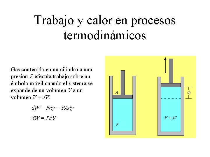 Trabajo y calor en procesos termodinámicos Gas contenido en un cilindro a una presión P efectúa trabajo sobre un émbolo móvil cuando el sistema se expande de un volumen V a un volumen V + d. V. d. W = Fdy = PAdy d. W = Pd. V