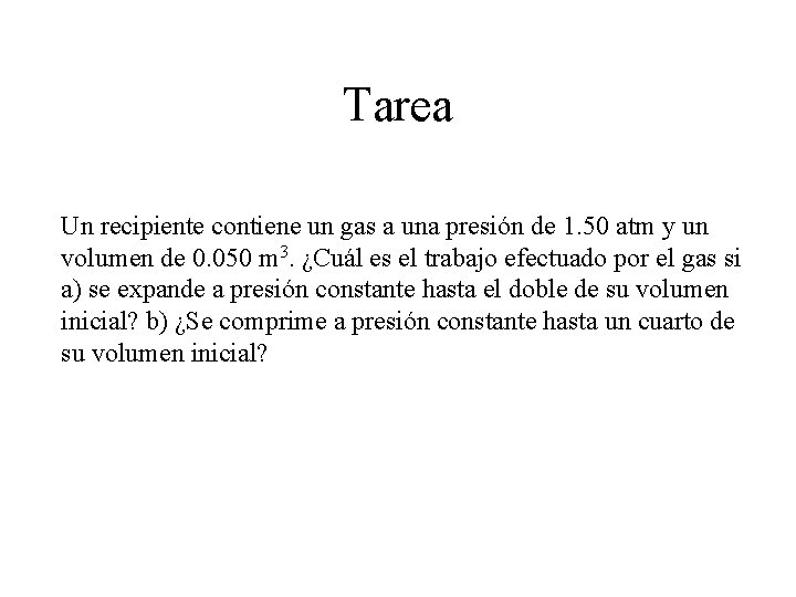 Tarea Un recipiente contiene un gas a una presión de 1. 50 atm y un volumen de 0. 050 m 3. ¿Cuál es el trabajo efectuado por el gas si a) se expande a presión constante hasta el doble de su volumen inicial? b) ¿Se comprime a presión constante hasta un cuarto de su volumen inicial?