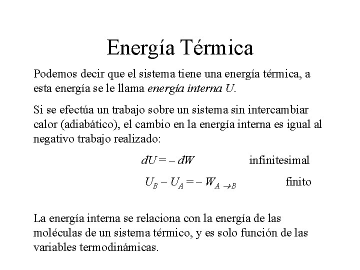 Energía Térmica Podemos decir que el sistema tiene una energía térmica, a esta energía se le llama energía interna U. Si se efectúa un trabajo sobre un sistema sin intercambiar calor (adiabático), el cambio en la energía interna es igual al negativo trabajo realizado: d. U = – d. W infinitesimal UB – UA = – WA B finito La energía interna se relaciona con la energía de las moléculas de un sistema térmico, y es solo función de las variables termodinámicas.