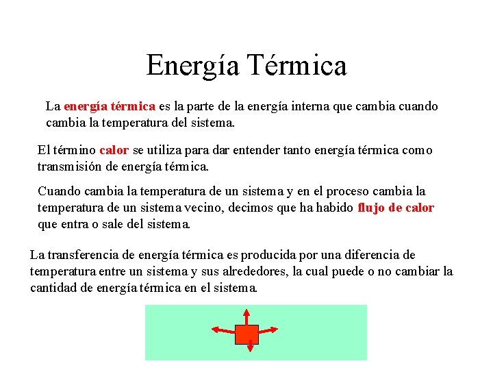 Energía Térmica La energía térmica es la parte de la energía interna que cambia cuando cambia la temperatura del sistema. El término calor se utiliza para dar entender tanto energía térmica como transmisión de energía térmica. Cuando cambia la temperatura de un sistema y en el proceso cambia la temperatura de un sistema vecino, decimos que ha habido flujo de calor que entra o sale del sistema. La transferencia de energía térmica es producida por una diferencia de temperatura entre un sistema y sus alrededores, la cual puede o no cambiar la cantidad de energía térmica en el sistema.