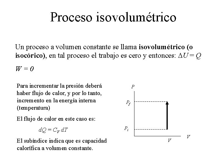 Proceso isovolumétrico Un proceso a volumen constante se llama isovolumétrico (o isocórico), en tal proceso el trabajo es cero y entonces: DU = Q W=0 Para incrementar la presión deberá haber flujo de calor, y por lo tanto, incremento en la energía interna (temperatura) P Pf El flujo de calor en este caso es: d. Q = CV d. T El subíndice indica que es capacidad calorífica a volumen constante. Pi V V