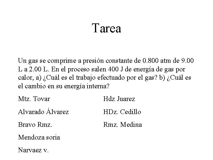 Tarea Un gas se comprime a presión constante de 0. 800 atm de 9. 00 L a 2. 00 L. En el proceso salen 400 J de energía de gas por calor, a) ¿Cuál es el trabajo efectuado por el gas? b) ¿Cuál es el cambio en su energía interna? Mtz. Tovar Hdz Juarez Alvarado Álvarez HDz. Cedillo Bravo Rmz. Medina Mendoza soria Narvaez v.