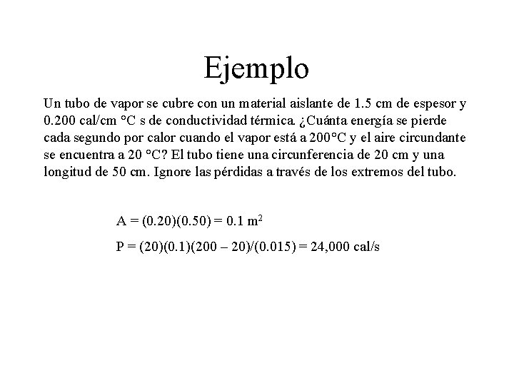 Ejemplo Un tubo de vapor se cubre con un material aislante de 1. 5 cm de espesor y 0. 200 cal/cm °C s de conductividad térmica. ¿Cuánta energía se pierde cada segundo por calor cuando el vapor está a 200°C y el aire circundante se encuentra a 20 °C? El tubo tiene una circunferencia de 20 cm y una longitud de 50 cm. Ignore las pérdidas a través de los extremos del tubo. A = (0. 20)(0. 50) = 0. 1 m 2 P = (20)(0. 1)(200 – 20)/(0. 015) = 24, 000 cal/s