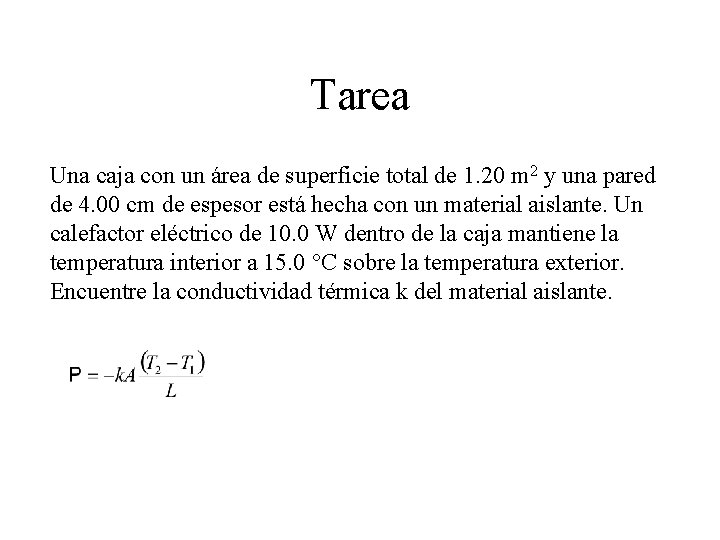 Tarea Una caja con un área de superficie total de 1. 20 m 2 y una pared de 4. 00 cm de espesor está hecha con un material aislante. Un calefactor eléctrico de 10. 0 W dentro de la caja mantiene la temperatura interior a 15. 0 °C sobre la temperatura exterior. Encuentre la conductividad térmica k del material aislante.