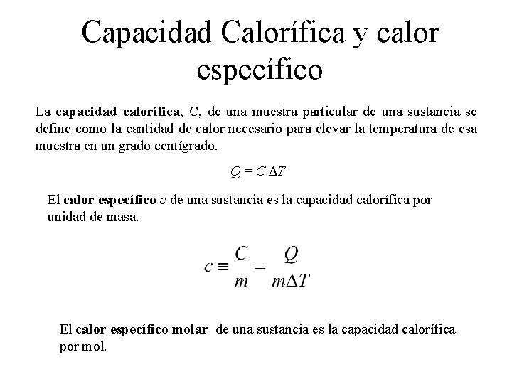 Capacidad Calorífica y calor específico La capacidad calorífica, C, de una muestra particular de una sustancia se define como la cantidad de calor necesario para elevar la temperatura de esa muestra en un grado centígrado. Q = C DT El calor específico c de una sustancia es la capacidad calorífica por unidad de masa. El calor específico molar de una sustancia es la capacidad calorífica por mol.