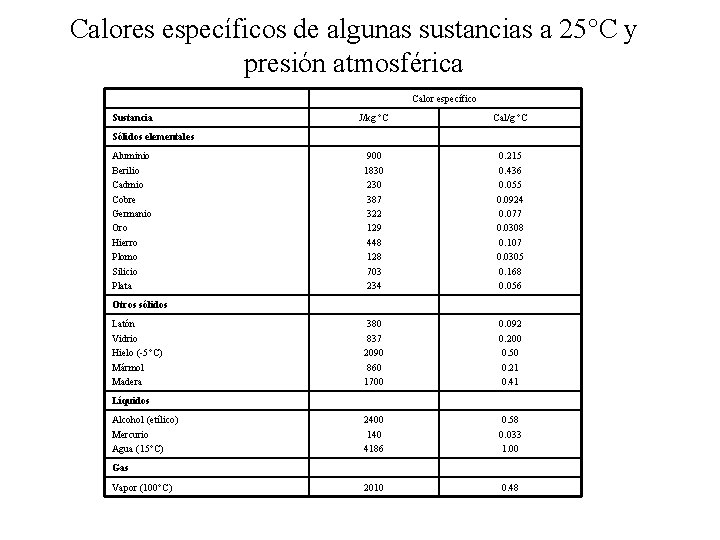 Calores específicos de algunas sustancias a 25°C y presión atmosférica Calor específico Sustancia J/kg °C Cal/g °C 900 1830 230 387 322 129 448 128 703 234 0. 215 0. 436 0. 055 0. 0924 0. 077 0. 0308 0. 107 0. 0305 0. 168 0. 056 380 837 2090 860 1700 0. 092 0. 200 0. 50 0. 21 0. 41 2400 140 4186 0. 58 0. 033 1. 00 2010 0. 48 Sólidos elementales Aluminio Berilio Cadmio Cobre Germanio Oro Hierro Plomo Silicio Plata Otros sólidos Latón Vidrio Hielo (-5°C) Mármol Madera Líquidos Alcohol (etílico) Mercurio Agua (15°C) Gas Vapor (100°C)