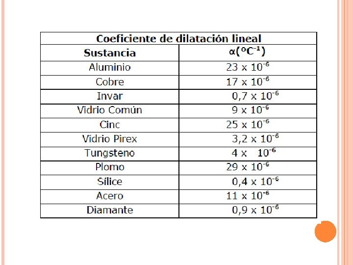 DILATACIÓN TÉRMICA Dilatación Lineal: corresponde a la variación de longitud ∆L de un cuerpo, que esta relacionada con el tipo de material y es proporcional a la longitud inicial L 0 y a la variación de temperatura ∆T que experimente: α corresponde al coeficiente de dilatación lineal.
