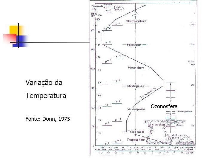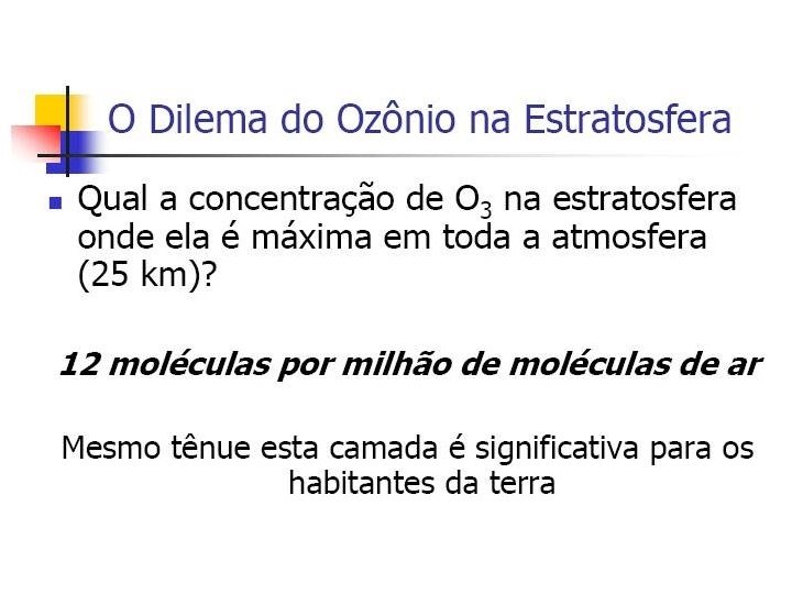 Teoria Fotoquímica de Chapman, 1930 • 1. O 2 + R O + O (fotodissociação do oxigênio) • 2. O + O 2 + M O 3 + M (M é um catalizador) • 3. O 3 + R O 2 + O (fotodissociação do ozônio) • 4. O + O 3 O 2 + O 2 (destruição do ozônio por colisões com oxigênio atômico – reinício do ciclo)