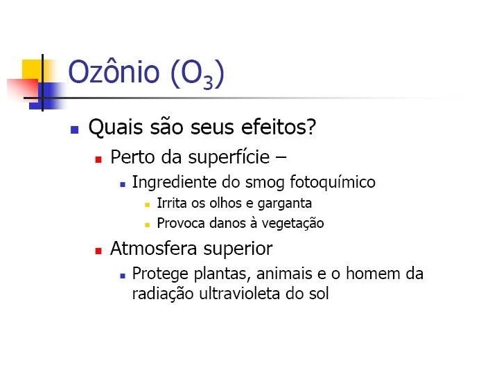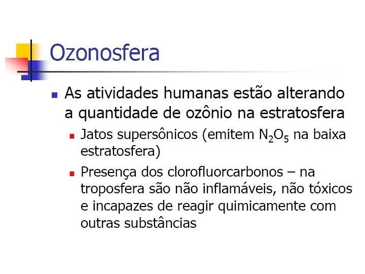 • >> Alta Reatividade (Ozonosfera: 30 km) • >> Produção e Destruição: EQULÍBRIO NATURAL O 3(g) + (R) O(g) + O 2(g) • Na atmosfera, a presença da radiação ultravioleta desencadeia um processo natural que leva à contínua formação e fragmentação do ozônio.