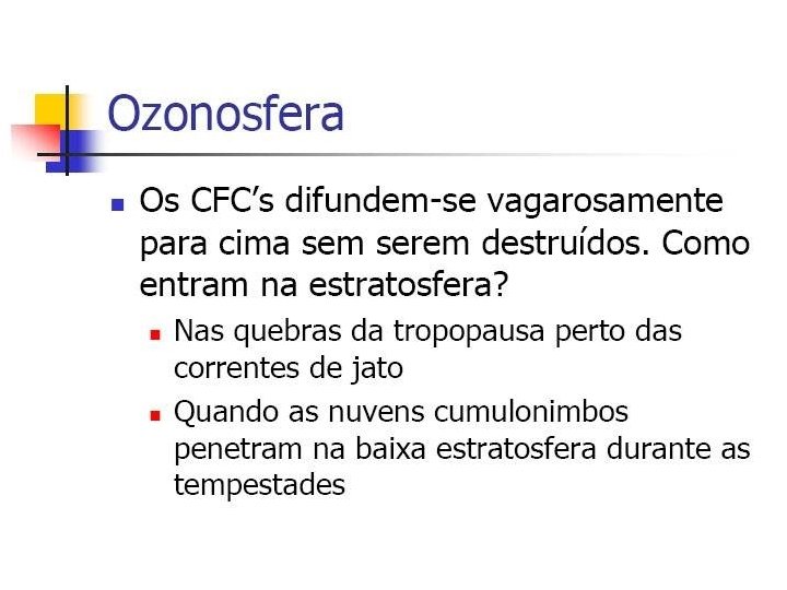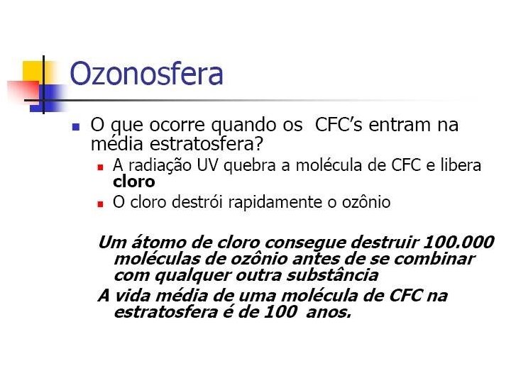 A destruição do ozônio acontece de forma natural e equilibrada, mas substâncias estranhas podem acelerar e desequilibrar esse processo, gerando, assim, o BURACO NA CAMADA DE OZÔNIO. CFCs e Br. FCs atravessam, intactos, as camadas mais baixas da atmosfera e se acumulam nas camadas superiores, onde as radiações UV são fortes o suficiente para decompor suas moléculas. LIBERAÇÃO DE BROMO E CLORO.