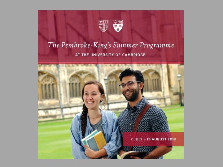 The PKP Experience • What is ‘The PKP Experience? ’ ü Excellent academic experience ü Exciting social programme ü Fantastic opportunity to experience Cambridge student life ü An unforgettable summer abroad! • Pembroke and King’s Colleges – friendly and supportive communities with outstanding facilities • Study with around 350 students from top universities all over the world: Yale, Harvard, Princeton and others