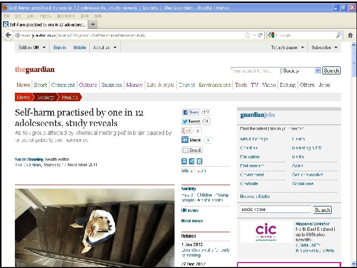 Prevalence increasing: 1980 s: 19, 000 presentations to hospitals of under 20 yearolds per year in England Wales Now: 25, 000 The Child and Adolescent Self-harm in Europe (CASE) study (2005) (n = 30, 000 ; 15 -16 year-olds): “an alarming rate of self-harming among young people: in the knowledge that their anonymity was protected, over 70 per cent…. admitted to self-harming at some stage in their lives”