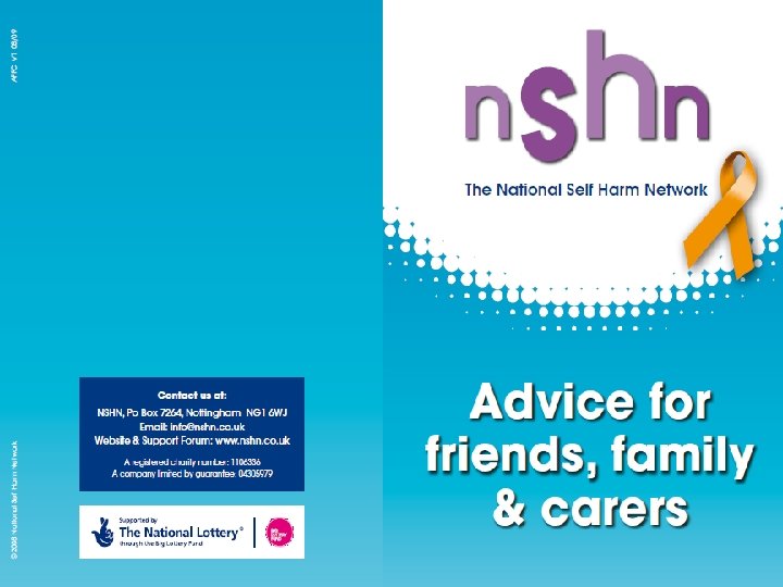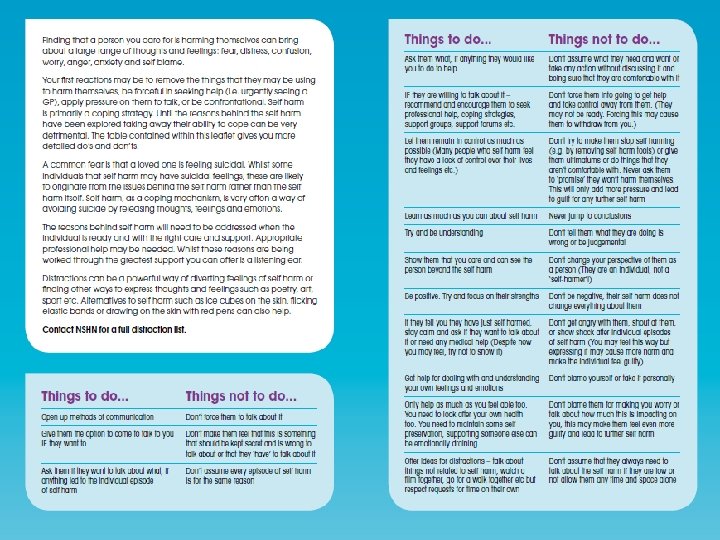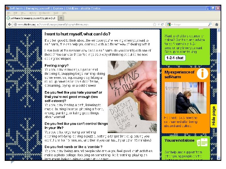 Useful websites NSPCC/Childline http: //www. childline. org. uk/Explore/Damaging. Yourself /Pages/Self. Harm. aspx • National Self harm Network http: //www. nshn. co. uk/index. html • Youth 2 Youth http: //www. youth 2 youth. co. uk/index. htm • The Site http: //www. thesite. org/healthandwellbeing/mentalhe alth/selfharm •