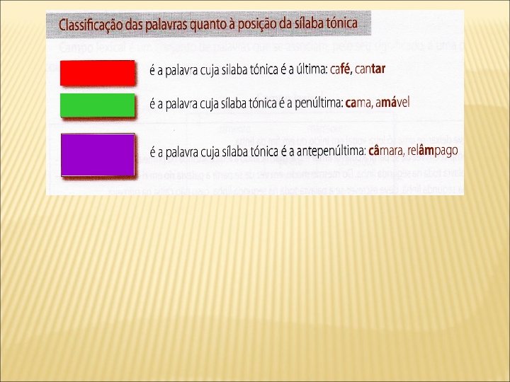 Classificação das palavras quanto à posição da sílaba tónica Nas palavras portuguesas o acento tónico situa-se numa das seguintes sílabas: na última, na penúltima ou na antepenúltima. ESDRÚXULAS (tónica na antepenúltima) relâmpago árvore contentíssimo GRAVES (tónica na penúltima) susto fácil contentar brincalhão saída pontapé mentiroso relâmpago susto brincalhão saída contentíssimo AGUDAS (tónica na última) pontapé árvore contentar mentiroso fácil