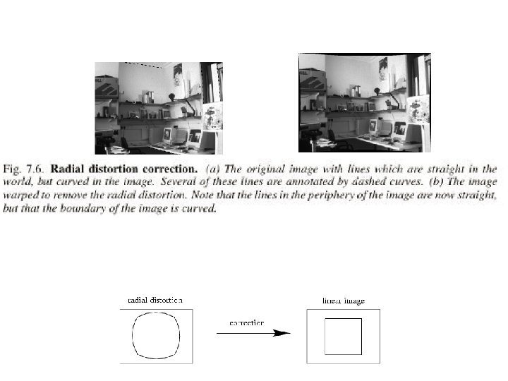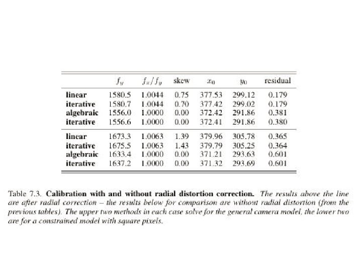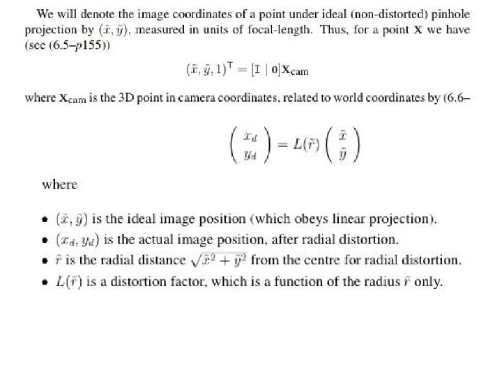 Correction of distortion x and y are the measured coordinates; Choice of the distortion function and center: xc and yc Computing the parameters of the distortion function (i) Minimize with additional unknowns: i. e. estimate kappa, center and P simultaneously (i) Straighten lines: determine L (r) so that images of straight scene lines should be straight; then solve for P