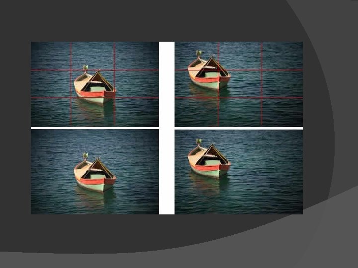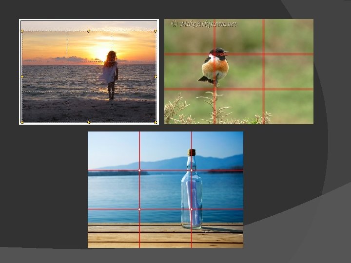 Rule of Thirds � Horizontal lines, like the horizon, can look boring if you place them in the centre of the screen. They look much better one third from the top or bottom. The same applies for vertical lines – put vertical objects one third in from the left or right of the screen. If you divide your screen into thirds, both vertically and horizontally, the four intersecting points are ‘points of interest’ where the eye is naturally drawn. Consider these ‘sweet-spots’ when framing up.