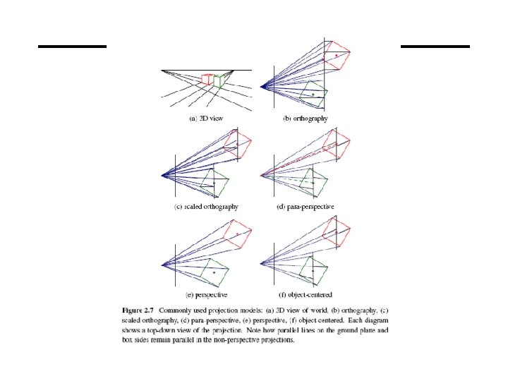 Three camera projections 3 -d point (1) Perspective: (2) Weak perspective: (3) Orthographic: 2 -d image position