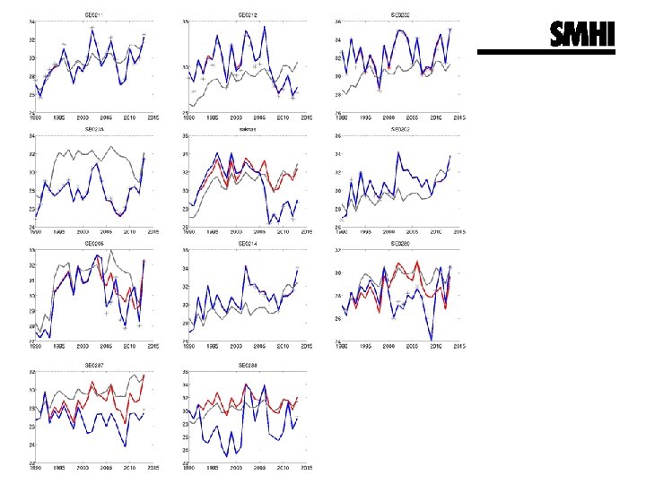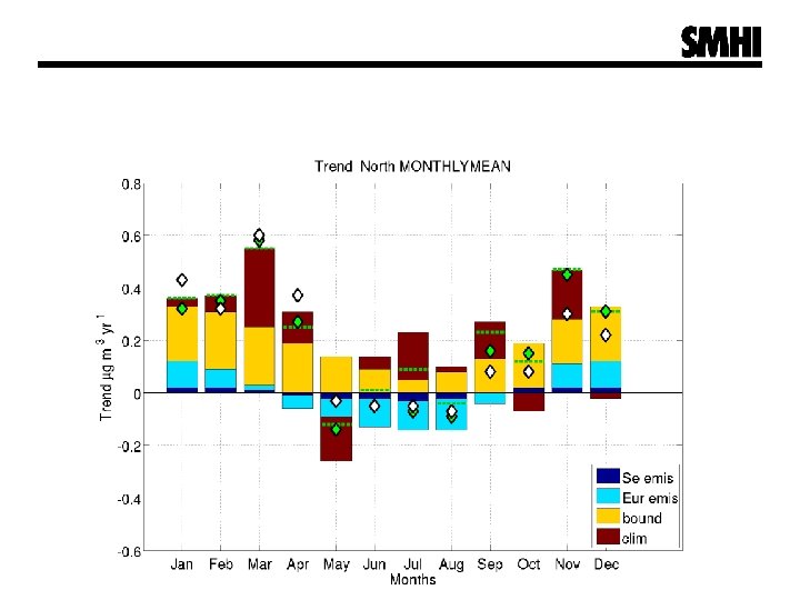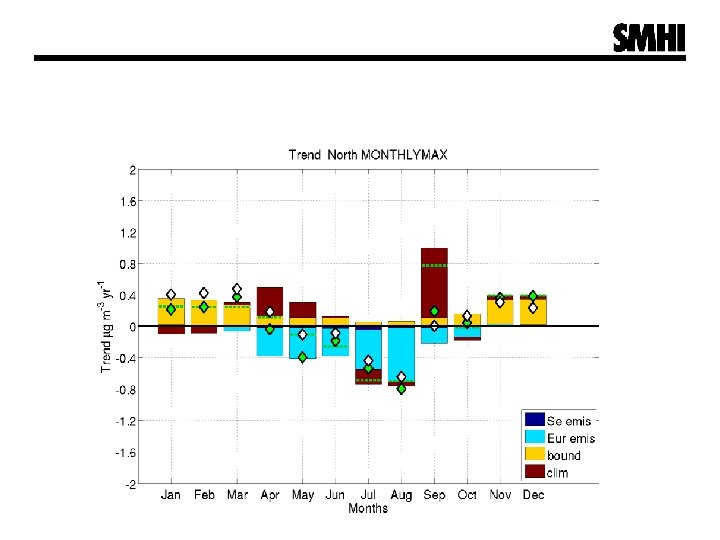 Contribution to trends - model scenarios § Change in climate (including § on-line modelled isoprene emissions) Change in anthopogenic emissions which is separated between § non-Swedish European § anthropogenic emissions Swedish anthropogenic emissions § Change in lateral and top boundaries Scenario Description m 8 Base scenario, used as input to the reanalysis. m 10 The meteorology is set to the level of 2011. M 9 Constant European anthropogenic emissions set to the level of 2011. m 14 Constant Swedish anthropogenic emissions set to the level of 2011. m 6 Constant top and lateral boundaries for all species set to the level of 2011.