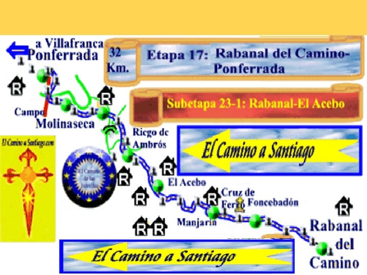 Rabanal del Camino. Localidad estratégica en la que antiguamente los peregrinos se agrupaban para afrontar la peligrosa travesía del Monte Irago. En la Edad Media, los monjes templarios, de importancia en la protección de los peregrinos, construyeron aquí varios hospitales e iglesias.