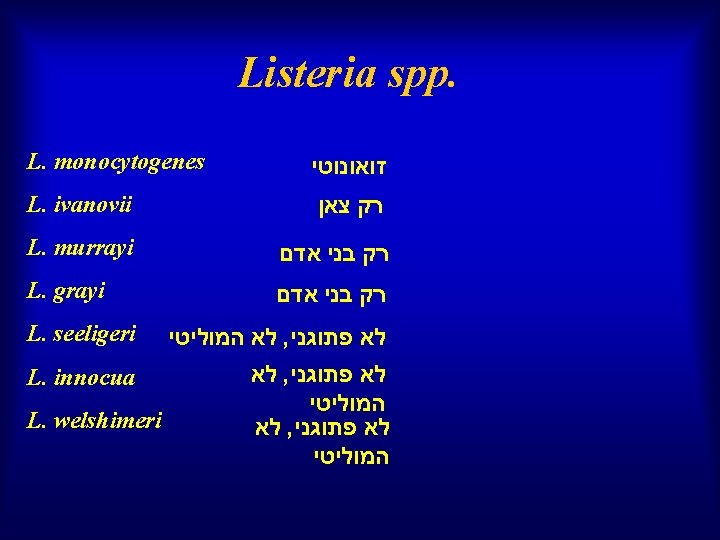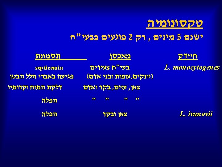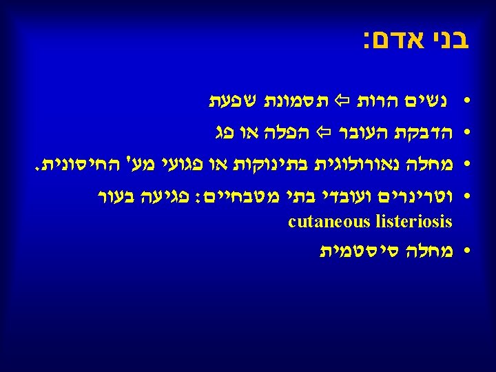 Listeria monocytogenes infection in Israel and review of cases worldwide Emerging Infectious Diseases , March, 2002 by Yardena Siegman-Igra , Rotem Levin , Miriam Weinberger , Yoav Golan , David Schwartz , Zmira Samra , Hana Konigsberger , Amos Yinnon , Galia Rahav , Nathan Keller , Nail Bisharat , Jehuda Karpuch , Renato Finkelstein , Michael Alkan , Zvi Landau , Julia Novikov , David Hassin , Carlos Rudnicki , Ruth Kitzes , Shmouel Ovadia , Zvi Shimoni , Ruth Lang , Tamar Shohat Listeria monocytogenes, an uncommon foodborne pathogen, is increasingly recognized as a cause of life-threatening disease. A marked increase in reported cases of listeriosis during 1998 motivated a retrospective nationwide survey of the infection in Israel. From 1995 to 1999, 161 cases were identified; 70 (43%) were perinatal infections, with a fetal mortality rate of 45%. Most (74%) of the 91 nonperinatal infections involved immunocompromised patients with malignancies, chronic liver disease, chronic renal failure, or diabetes mellitus. The common clinical syndromes in these patients were primary bacteremia (47%) and meningitis (28%). The crude case-fatality rate in this group was 38%, with a higher death rate in immunocompromised patients.
