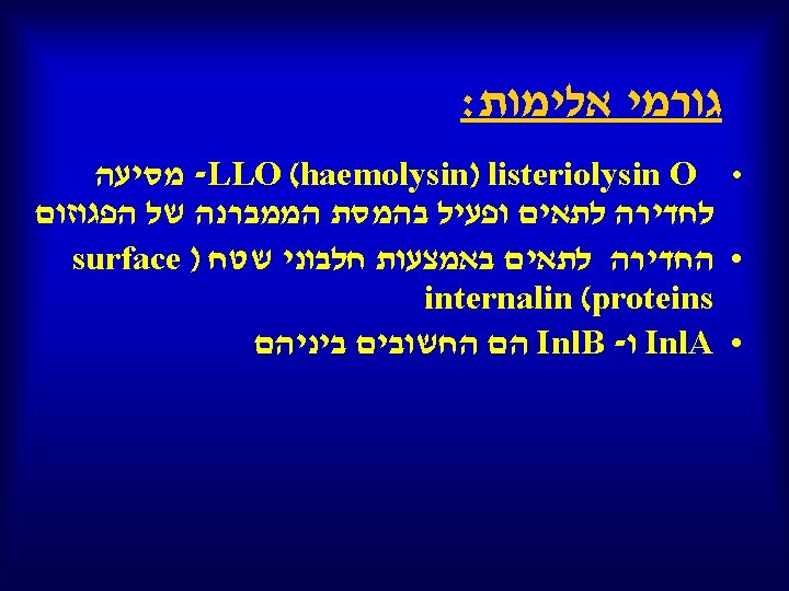 Virulence Factors • Actin-based motility Act. A • Adherence Ami Fbp. A • Bile resistance BSH • Exoenzyme Mpl Plc. A Plc. B SMase (L. ivanovii) • Intracellular growth Hpt Lpl. A 1 Svp. A • Invasion Auto Inl. A Inl. B Lpe. A p 60 • Peptidase Lsp • Regulation Prf. A • Stress protein Clp. C Clp. E Clp. P • Toxin LLO LLS