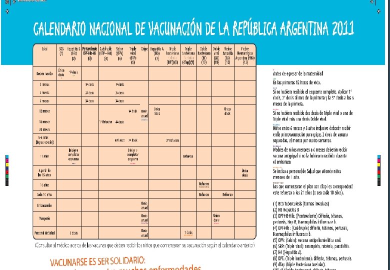 Acciones propuestas ü Alto compromiso político (gobernadores y/o ministros) líderes opinión, culturales, educacionales y políticos ü Lanzamiento simultáneo en lugares estratégicos, tanto a nivel nacional, como en todas las jurisdicciones. ü Articulación intra e intersectorial: ü PAI/OPS ü Otros Programas: Maternidad e Infancia, Municipios Saludables, Médicos Comunitarios, UNAMOS, ü Ministerio de Educación/Pro. San. E: Vacunación en las escuelas ü Sociedades Científicas ü Medios de comunicación masivos, medios gráficos