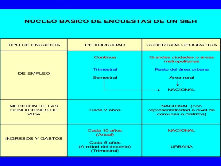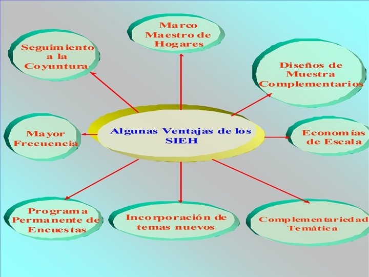 UNA PROPUESTA: PROPUESTA El Sistema Integrado de Encuestas de Hogares • Mejorar la calidad, cobertura, oportunidad, consistencia y complementariedad de las informaciones mediante un conjunto articulado de encuestas de hogares. • Atender a los diversos requerimientos de información del área económica y social • Aumentar la eficiencia en el uso de los recursos