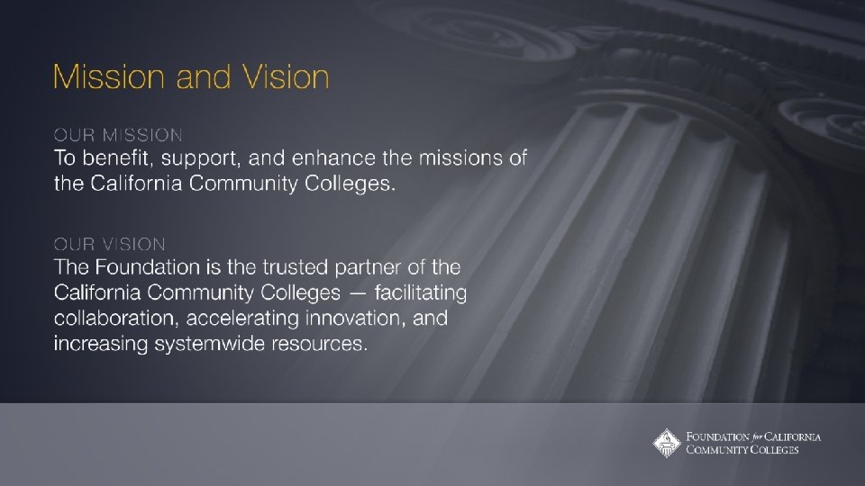 PRIMARY CALIFORNIA COMMUNITY COLLEGE STRATEGIES The Chancellor’s Vision for Success • Increase the number of students earning credentials by at least 20% • Increase the number of students who transfer by 35% • Reduce units accumulated by students who complete degrees • Increase the number of students who get jobs in their field of study • Fully close equity and regional achievement gaps within 10 years