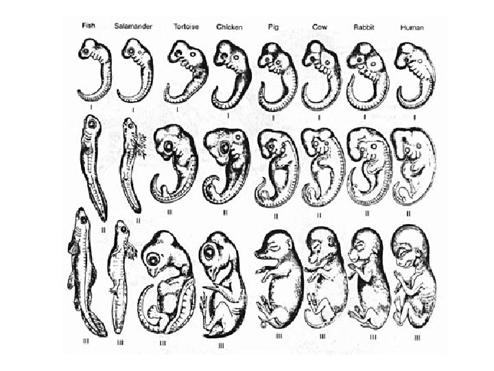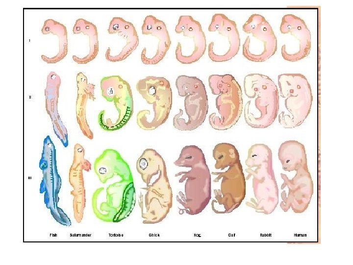 Evidence for evolution – Comparative embryology These are the embryos of: tortoise, pig, cow, chicken, fish, rabbit, salamander and human. Which one is which?