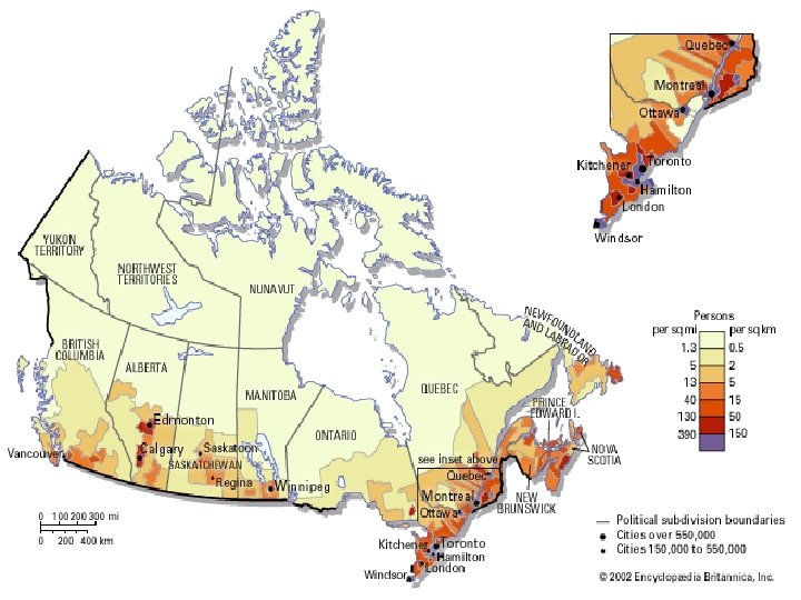 Where do People live in Canada? 1. Close to the U. S. A. border – Most Canadian cities are within 325 km of the border – Why do we need the U. S. A? • Trade • Shopping • Protection