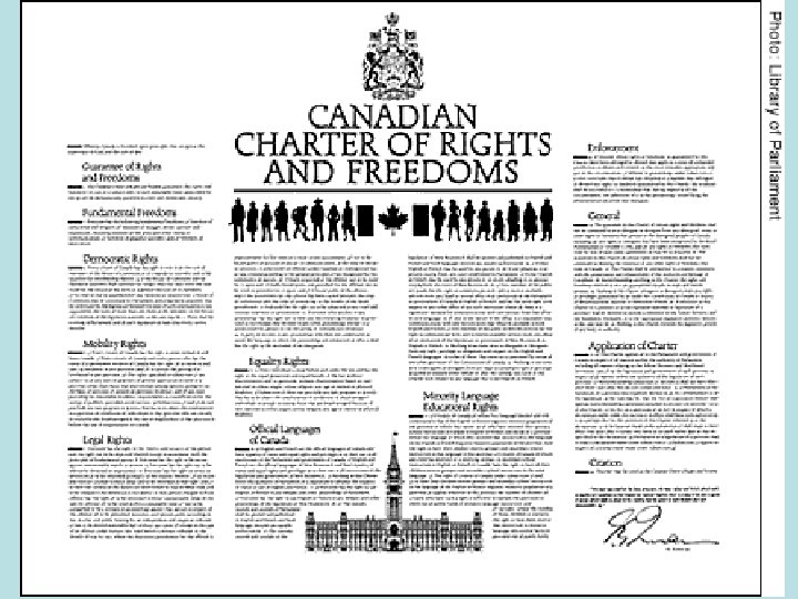 4. Legal Rights • Right to life, liberty and security of the person • Right to a fair trial and lawyer • Innocent until proven guilty • Right to not be subjected to cruel and unusual treatment 5. Equality Rights • Freedom from discrimination based on race, ethnic origin, religion sex, age, or mental or physical disability • Permission for affirmative action programs which allow preferential hiring for members of disadvantaged groups